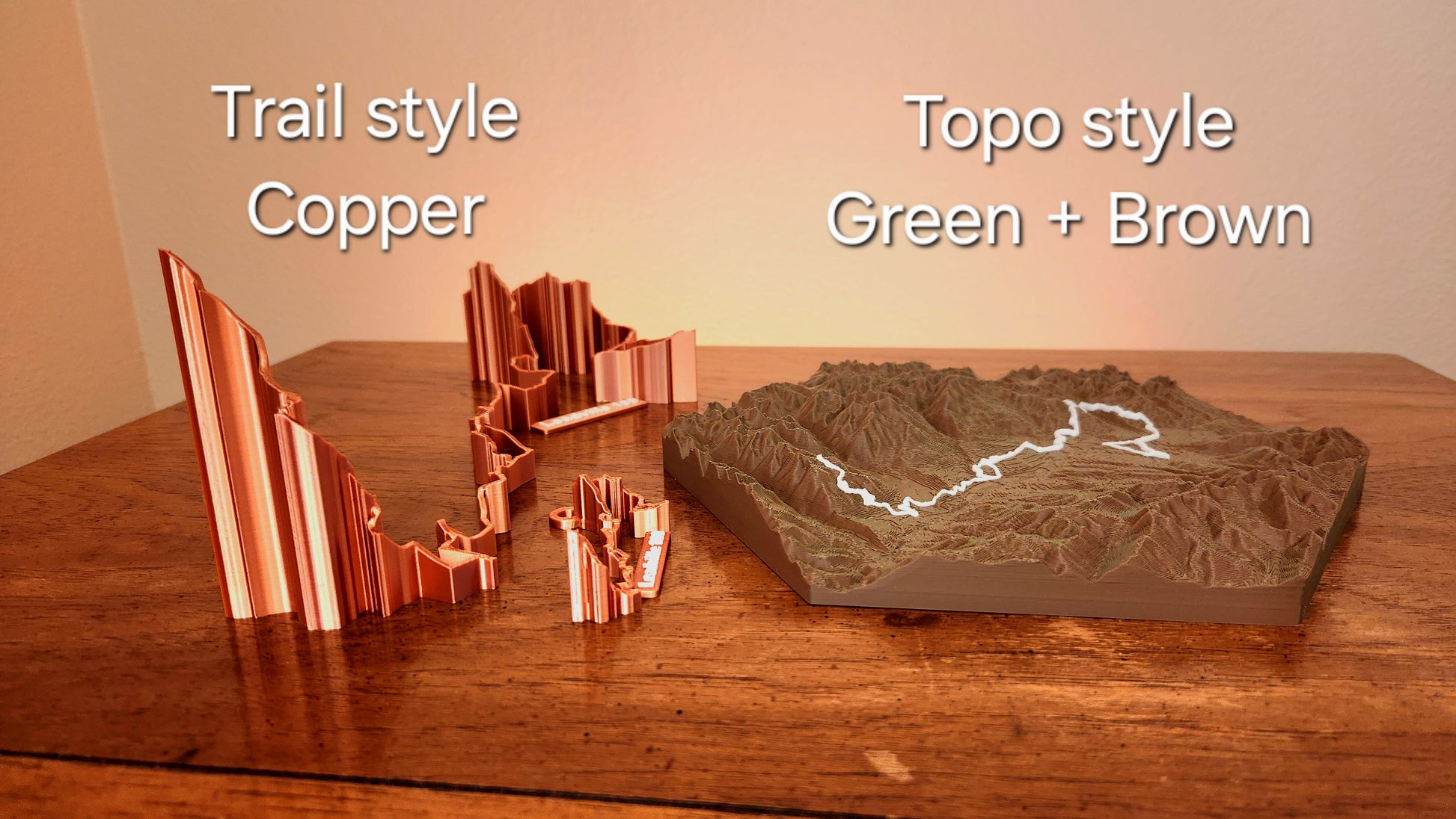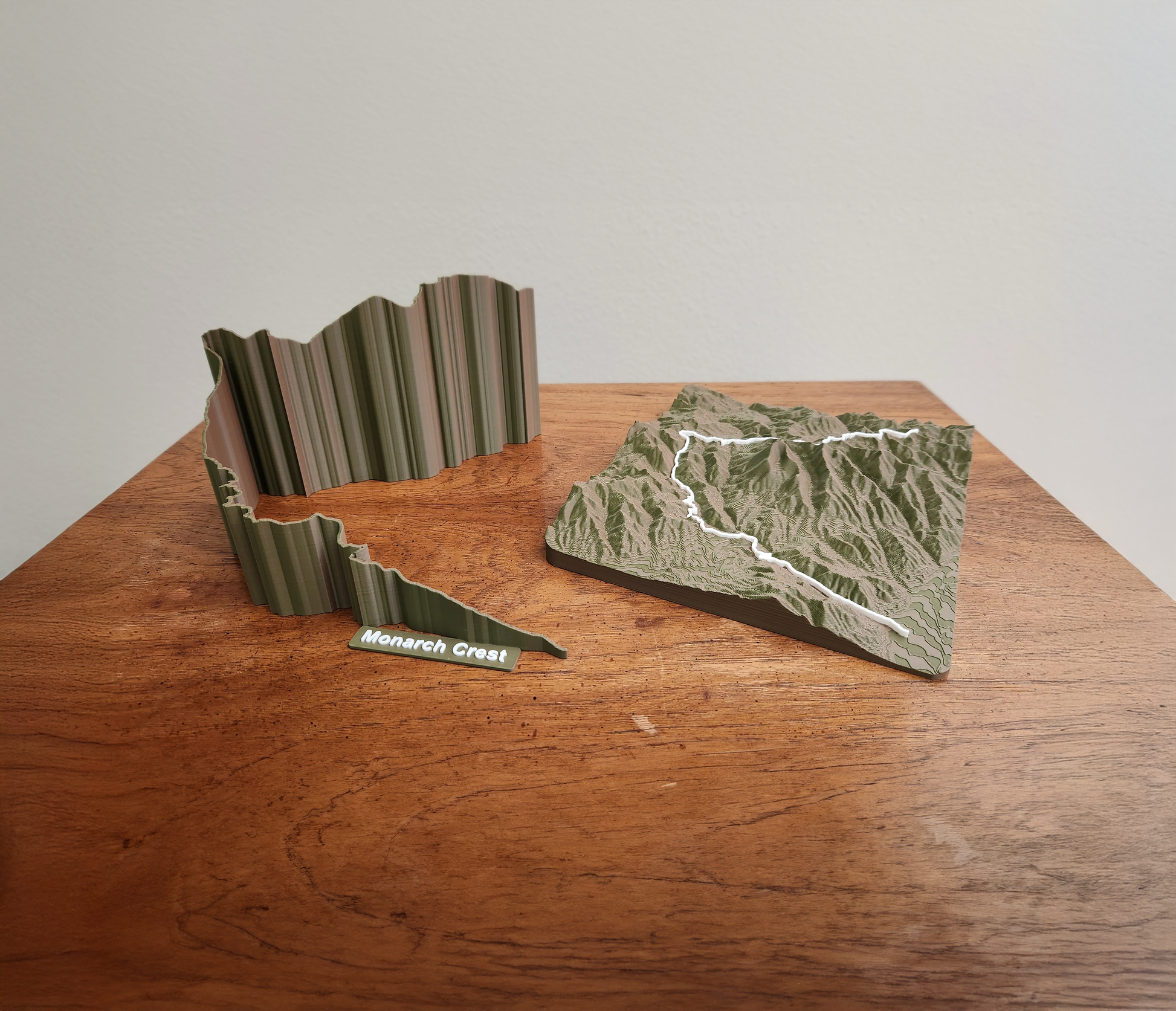 Topo Sculpture – This version includes the surrounding terrain along with your trail, offering an immersive geographic context that shows how your route winds through valleys, ridges, and mountains. It’s perfect for visualizing the full environment of your journey.